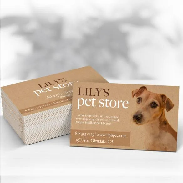 Thick, rich, light brown kraft paper has natural fibers and subtle visible flecks to give brown kraft business cards an organic look and feel. The stock is 100% recycled lending to its rustic, eco-friendly appeal. For a more dramatic effect, add a pop of vibrant white ink to the light brown stock to enhance text and graphics on business cards.